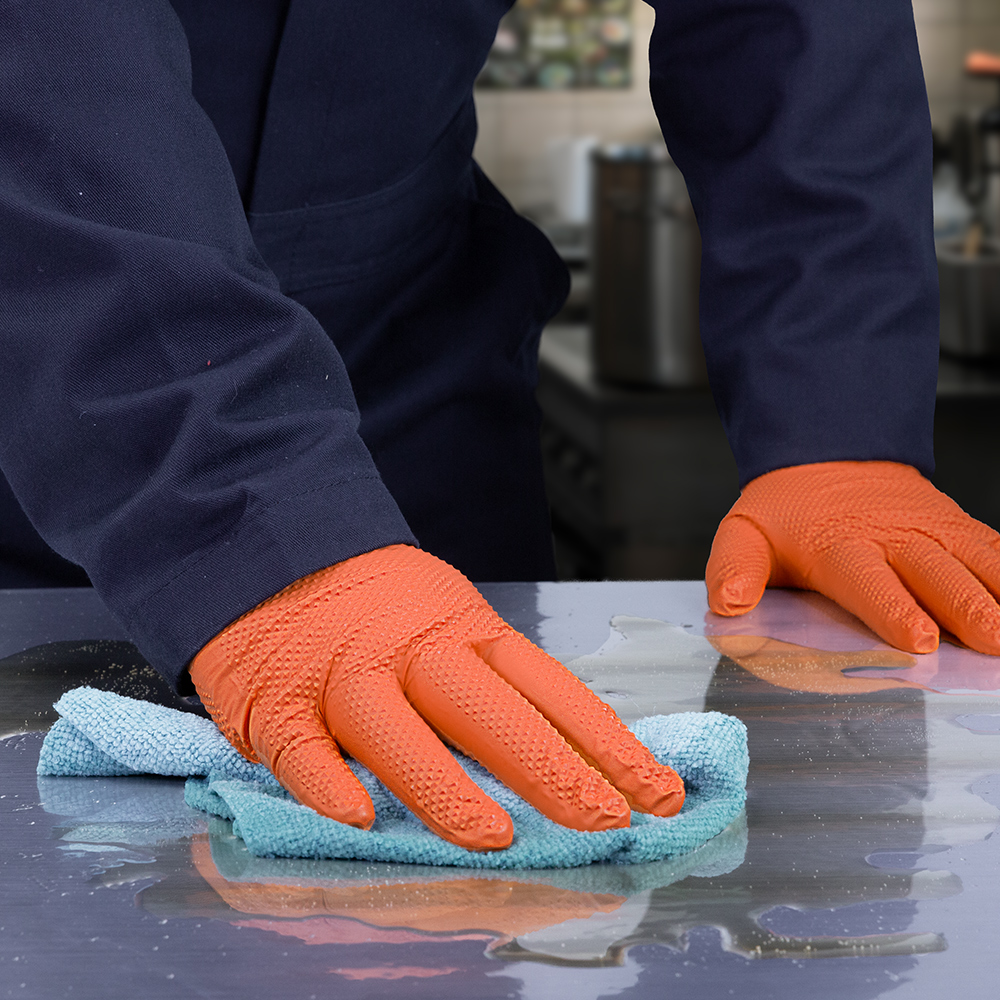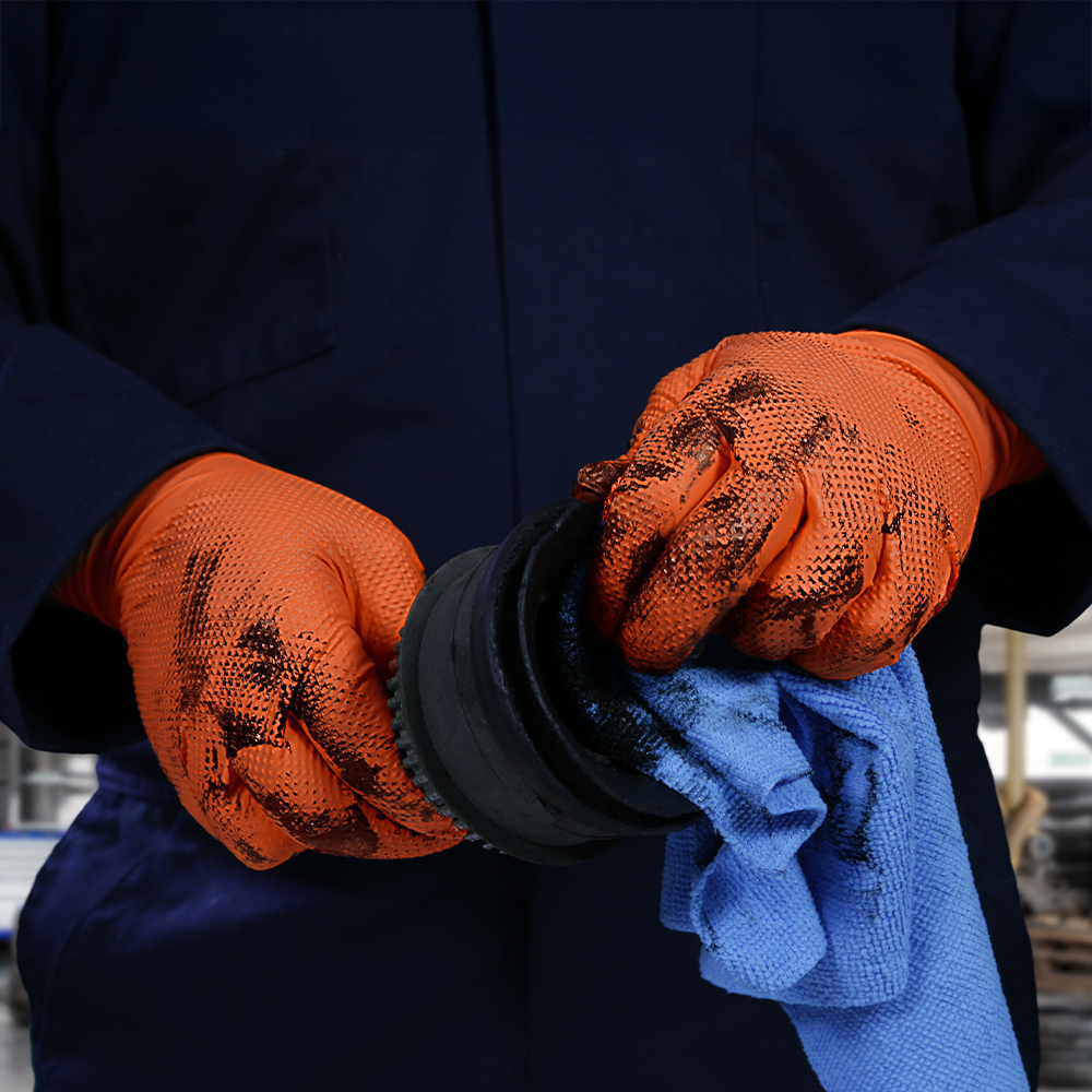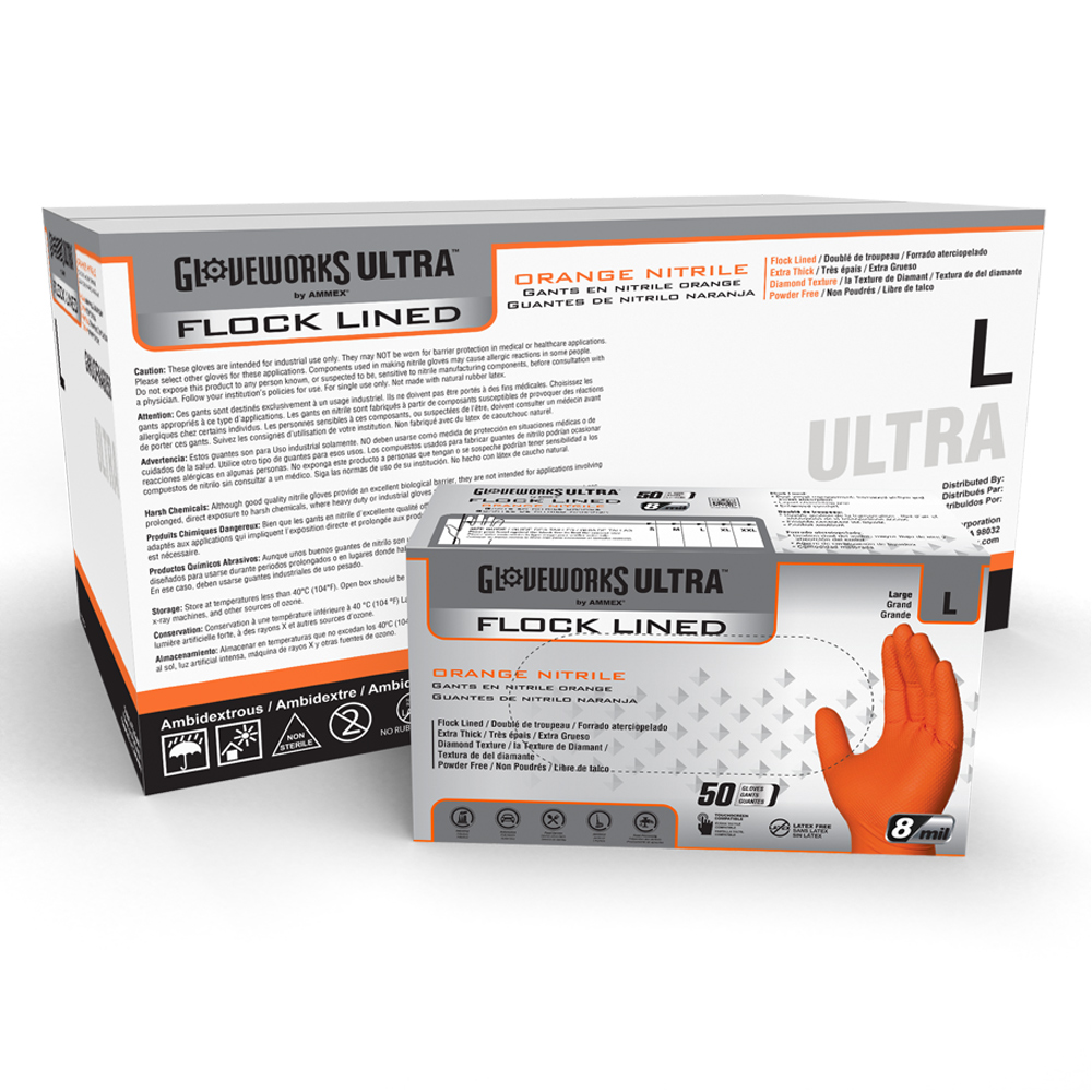 Gloveworks ULTRA™ Industrial Orange Flock-Lined Raised Diamond Texture nitrile disposable gloves are built for tough industrial jobs, offering durability, comfort, and performance. The sweat-absorbing flock lining combined with the raised diamond texture enhances airflow to keep hands cool and dry during extended use, while creating 60% more surface area for superior liquid-channeling grip. This design provides a more comfortable and secure fit compared to non-textured or non-flock-lined gloves, without compromising protection. These gloves also deliver excellent chemical and puncture resistance and are completely latex free, making them suitable for users with latex sensitivities.