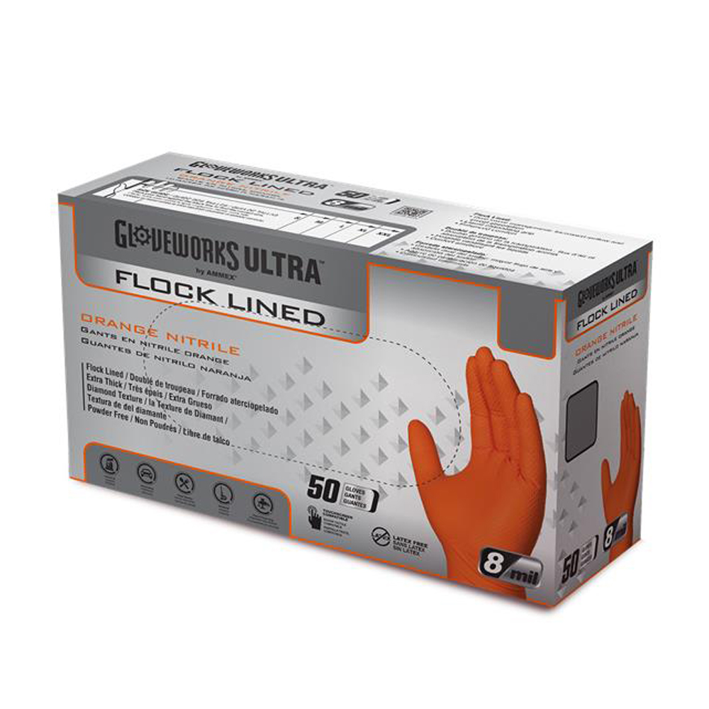AMMEX® Gloveworks® ULTRA™ GWUO 8-Mil Orange Flock Lined Nitrile Industrial Gloves